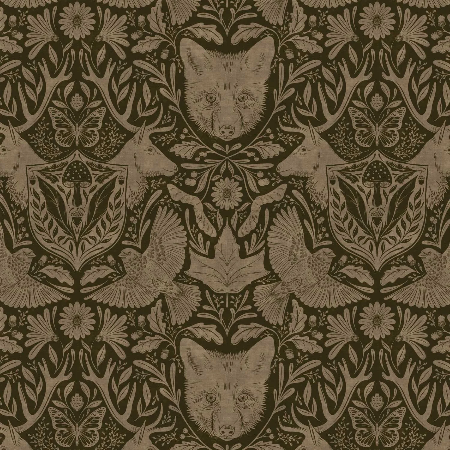 This licensable seamless surface pattern design features hand drawn deer, antlers, birds, mushrooms, butterflies, acorns and various forest flora. Inspired by vintage design it recalls a time when design focused on natural elements and earthy color palettes.