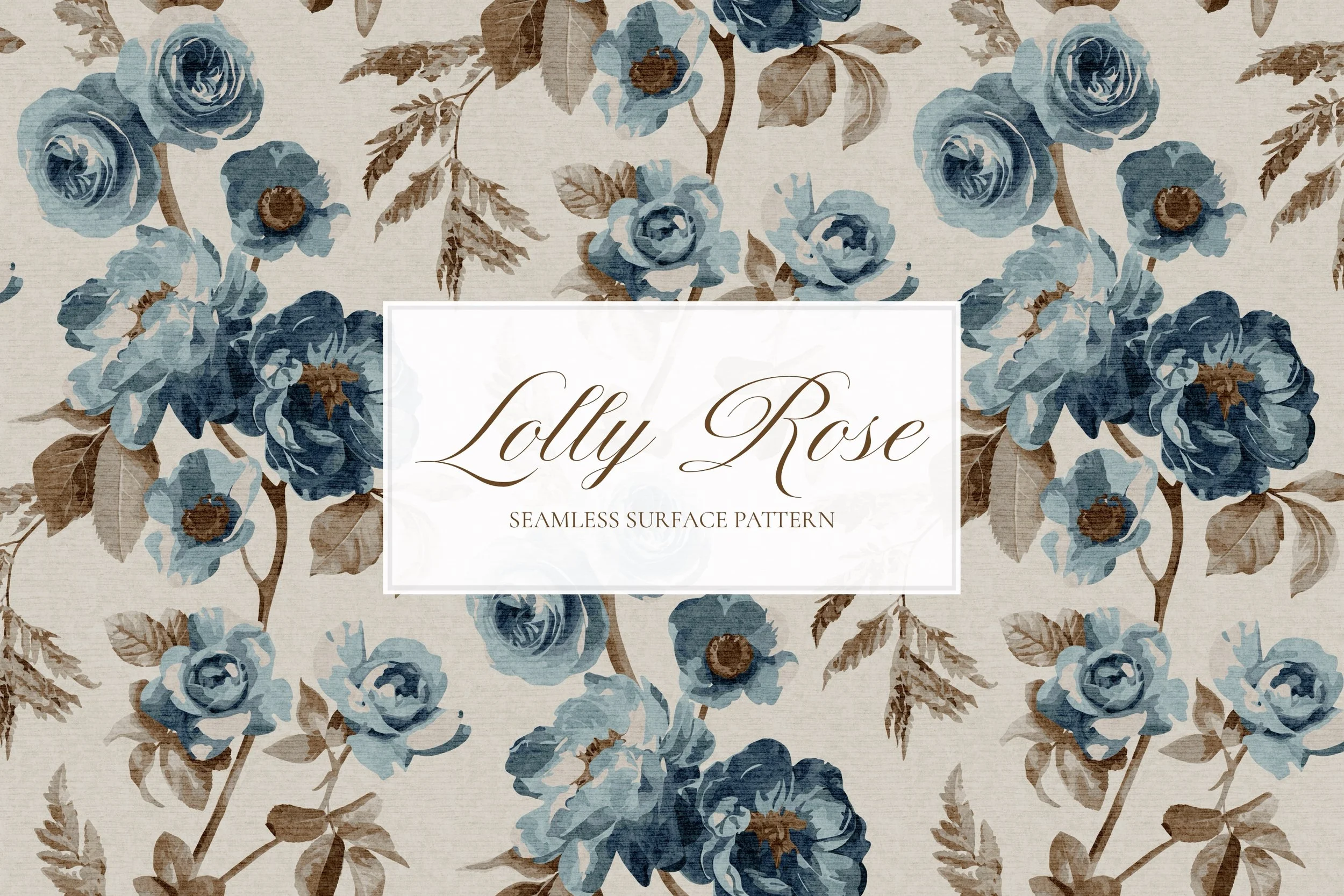 Romantic floral surface / seamless pattern inspired by vintage floral wallpaper and fabric designs. Featuring hand drawn intertwining roses, peonies, and leaves available in mauve, gray, and French blue color ways.